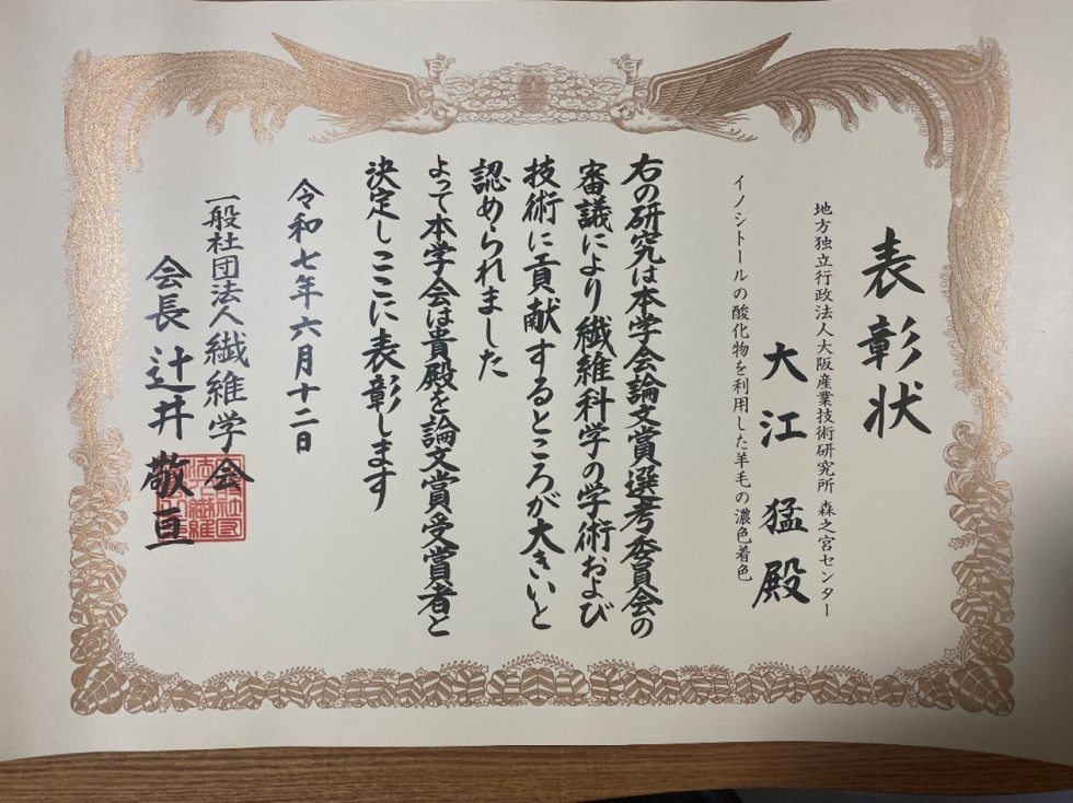 有機材料研究部 大江 猛 ファインケミカル材料研究室長、吉村 由利香 主幹研究員の研究論文が令和6年度(第51回)繊維学会 論文賞を受賞しました