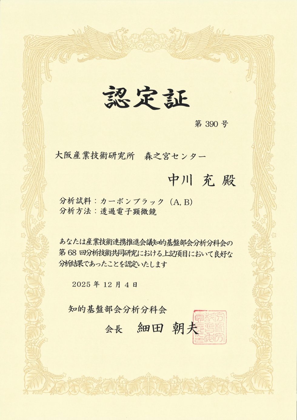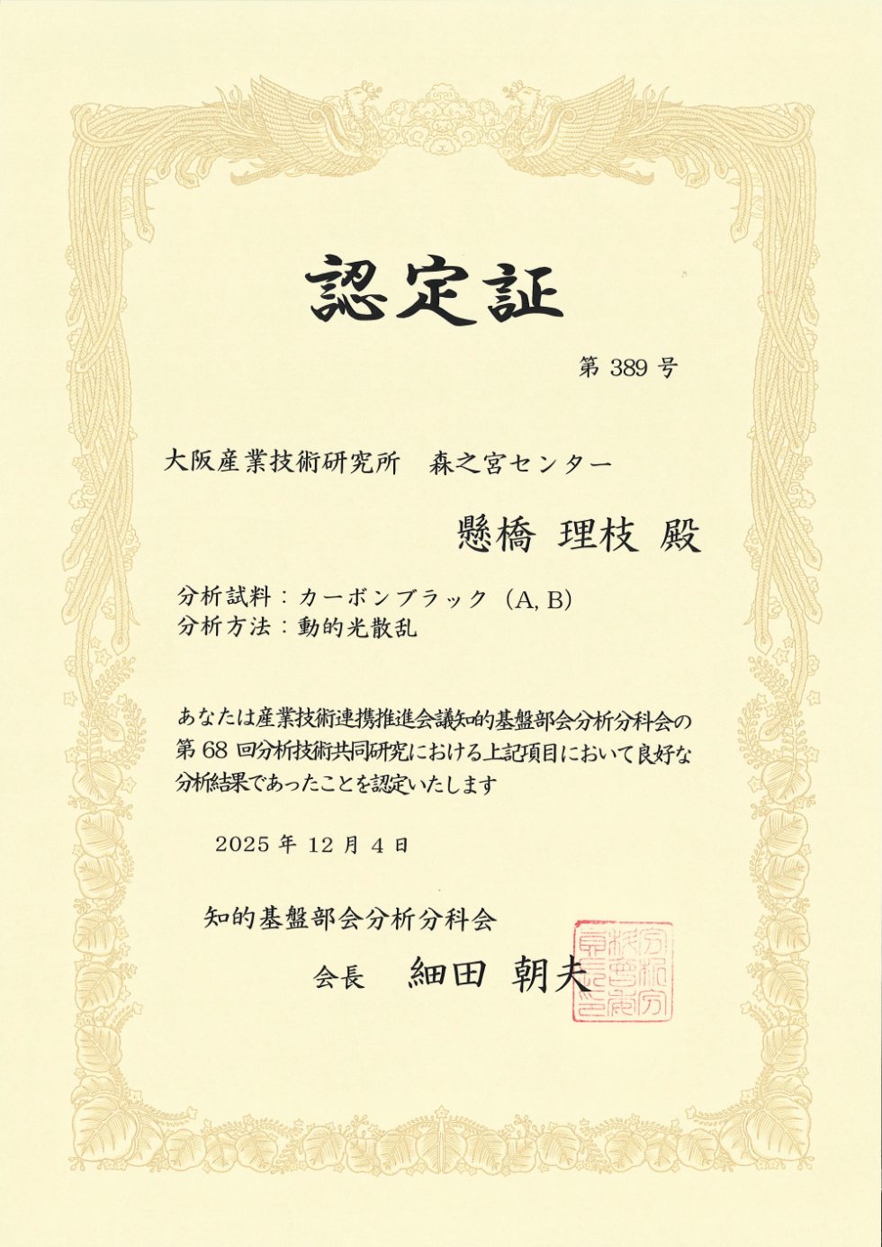懸橋 総括研究員、中川 研究員は、産業技術連携推進会議知的基盤部会分析分科会の、第68回分析技術共同研究に参加し、共通試料(カーボンブラックA, B)の動的光散乱法による粒径分析結果が良好であったことが認定され、「第68回分析技術共同研究 認定証」を授与されました。