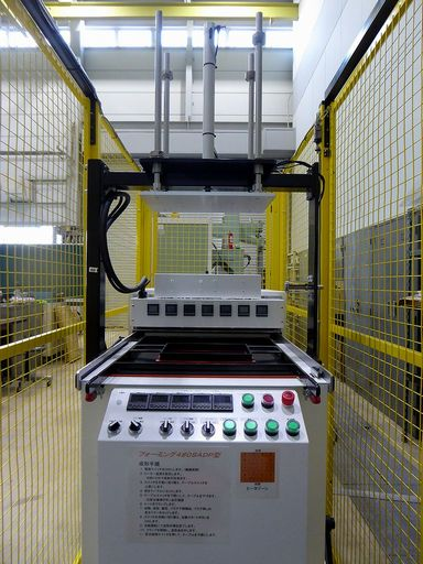 - 本装置は、熱可塑性樹脂シートを用いて真空成形を行うための装置です。成形用型には木材、樹脂、金属などの素材が使用でき、減面積プレートを併用することでA4およびはがきサイズ程度の比較的小さなシートでも成形が可能です。